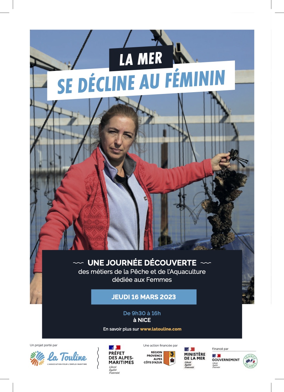 Dans le cadre du Plan de relance national sur la promotion des métiers de la pêche et de l’aquaculture, la déléguée départementale aux droits des femmes et à l'égalité des Alpes-Maritimes, la Direction Interrégionale de la Mer Méditerranée, la Région Provence-Alpes-Côte d’Azur et La Touline souhaitent vous faire découvrir la diversité et l'attractivité des métiers à l'occasion d'une journée d'information et de sensibilisation destinée aux femmes.