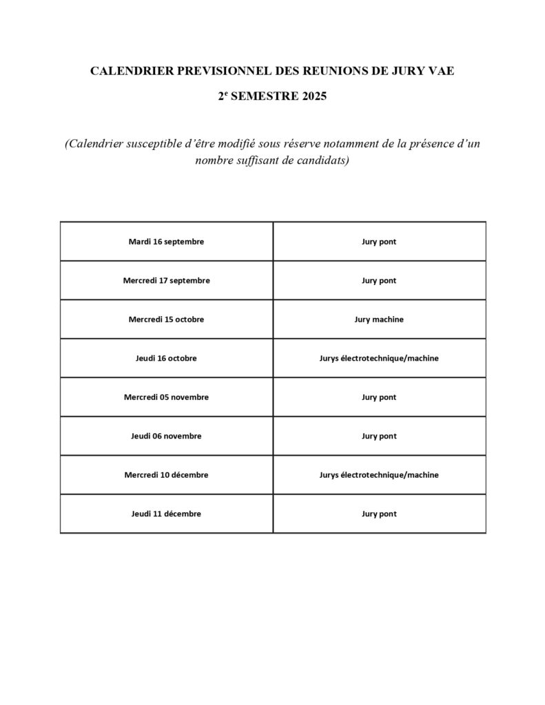 Le calendrier prévisionnel des réunions de jury VAE machine, électrotechnique et pont pour le prochain semestre vient d’être publié.