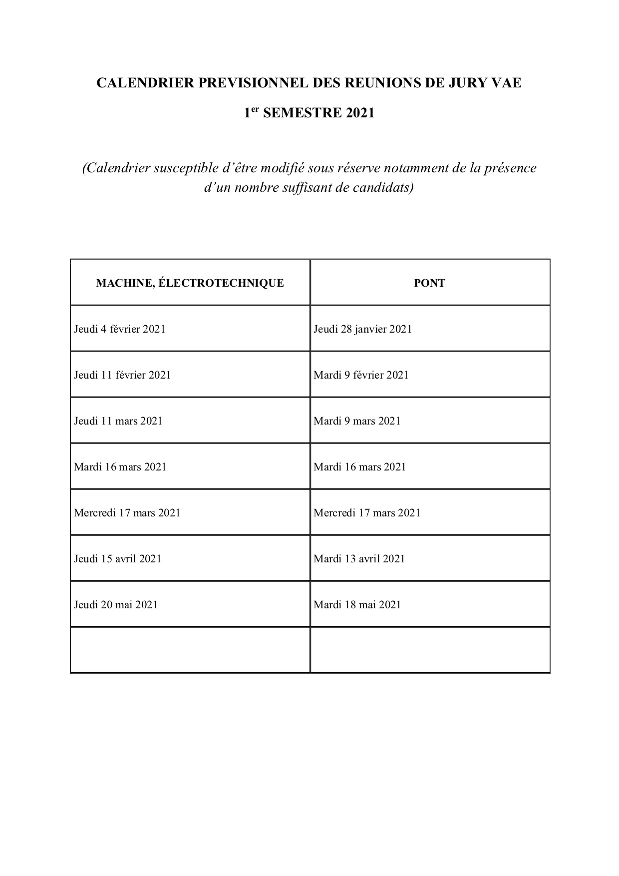 Calendrier prévisionnel des réunions de jury VAE - 1er semestre 2021