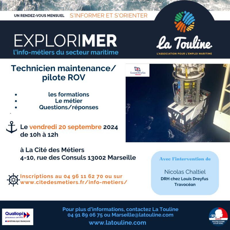 A Marseille au sein de la Cité des Métiers de Marseille et de Provence-Alpes-Côte d'Azur nous parlerons des métiers de technicien maintenance, pilote de ROV. Nous aurons le plaisir d'accueillir comme intervenant Nicolas CHALTIEL de LOUIS DREYFUS TRAVOCEAN.