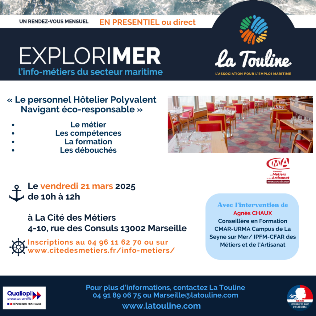 Le prochain rendez-vous ExploriMer à Marseille portera sur le personnel navigant des services généraux, notamment l'hôtellerie et la restauration.