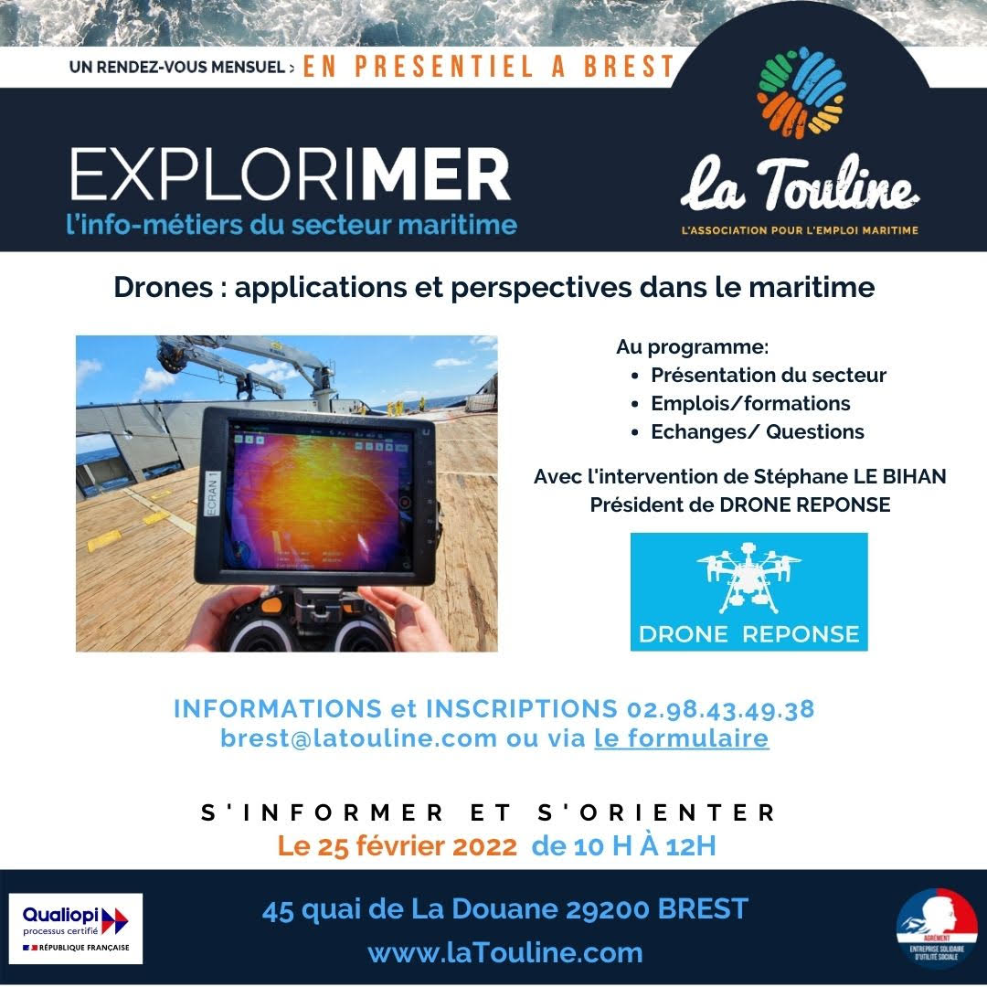 La thématique du prochain rendez-vous ExploriMer portera sur les drones et plus précisément leurs applications dans le secteur maritime, pour quelles activités, pour quels métiers et les perspectives de développement.