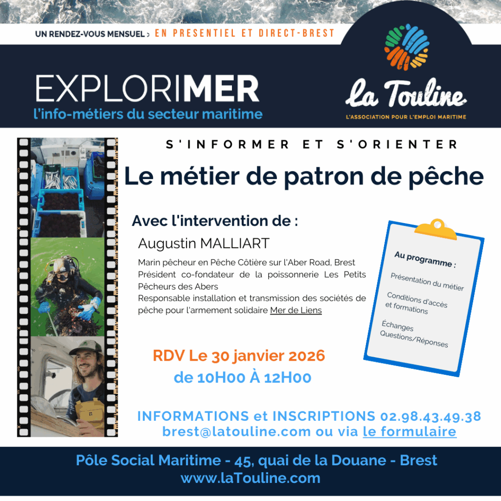 Le prochain rendez-vous ExploriMer portera sur le métier de patron de pêche. Nous vous donnons rendez-vous dans nos locaux où nous aurons le plaisir d’accueillir Augustin Malliart.