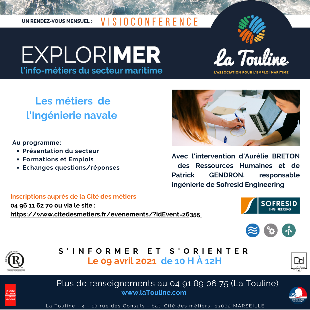 Pour y participer, il suffit de s'inscrire auprès de notre partenaire la Cité des Métiers de Marseille, soit par téléphone au 04 96 11 62 70 ou via leur site internet : https://www.citedesmetiers.fr/info-metiers/ rubrique Les Métiers de la Mer.