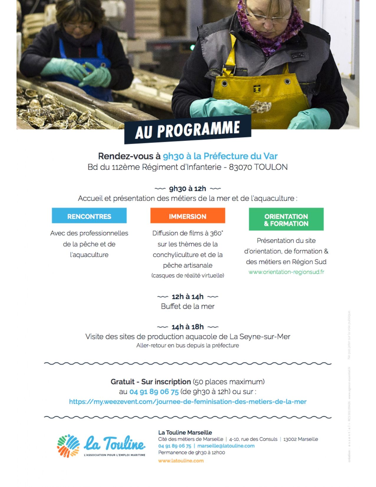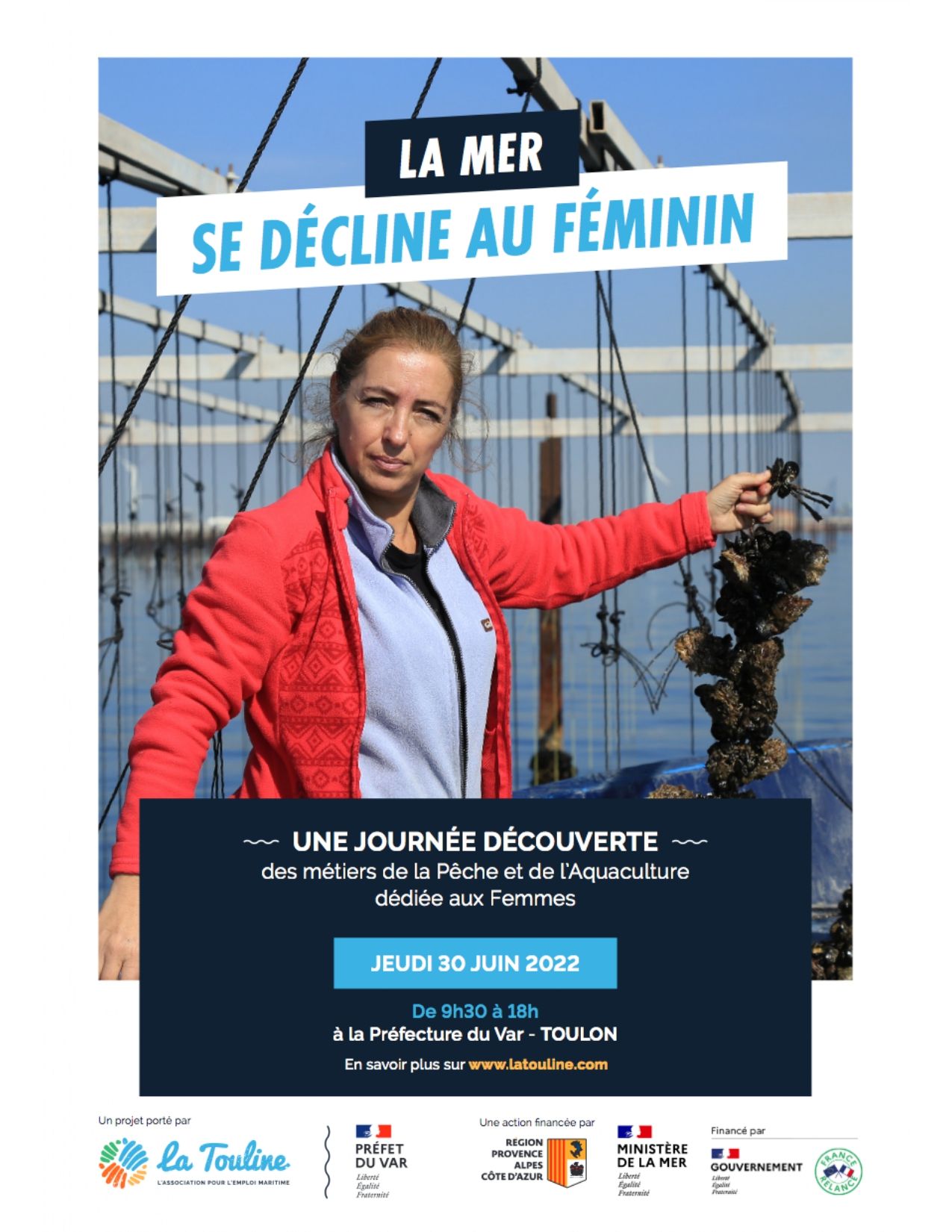 Nous vous invitons à participer le 30 juin prochain à la Journée de féminisation des métiers de la mer qui se tiendra à la préfecture du Var. L'objectif de cette journée à destination des femmes est de présenter les #métiers de la pêche et de l'aquaculture.La journée est organisée par La Touline et ses partenaires, la Région Provence-Alpes-Côte d'Azur et la Préfecture du Var.