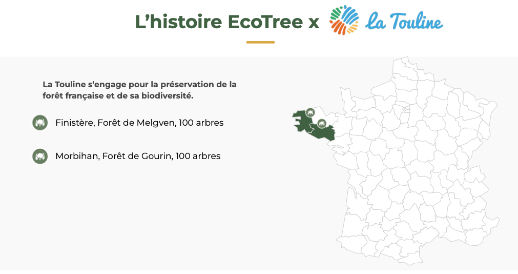Depuis 2021 avec EcoTree, nous participons à la création d’un puits de carbone en contribuant à la gestion durable de 200 arbres dans les forêts de Melgven (29) et de Gourin (56).