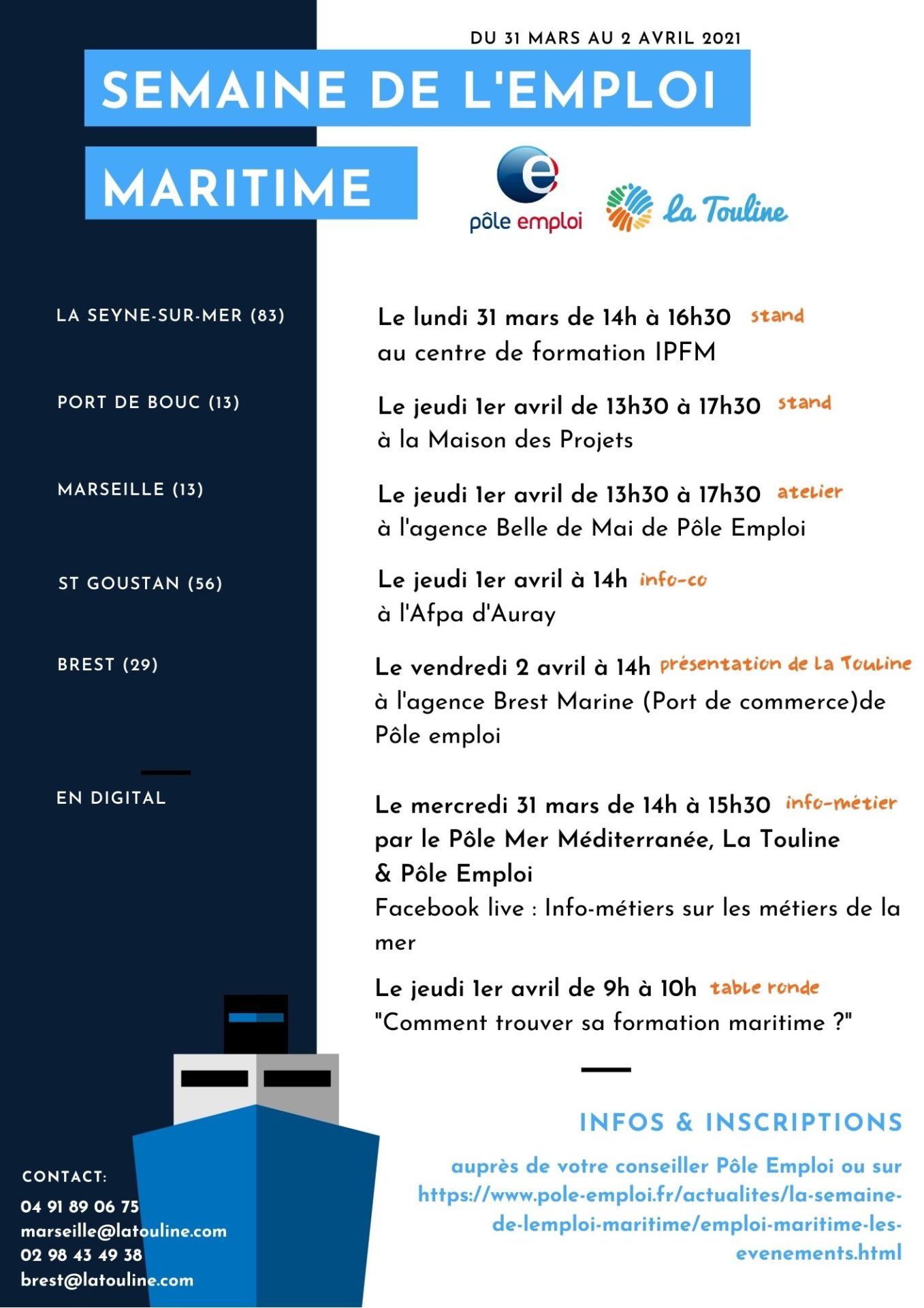 Contactez-nous pour plus d'informations ou sur https://www.pole-emploi.fr/actualites/la-semaine-de-lemploi-maritime.html