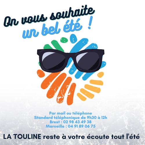 Image Titre LA TOULINE reste à votre écoute tout l'été Corps Durant la période estivale, les permanences aux bureaux de Brest et de Marseille sont assurées.Les prises de rendez-vous pour les bureaux de Lorient et de Nantes reprendront en septembre.