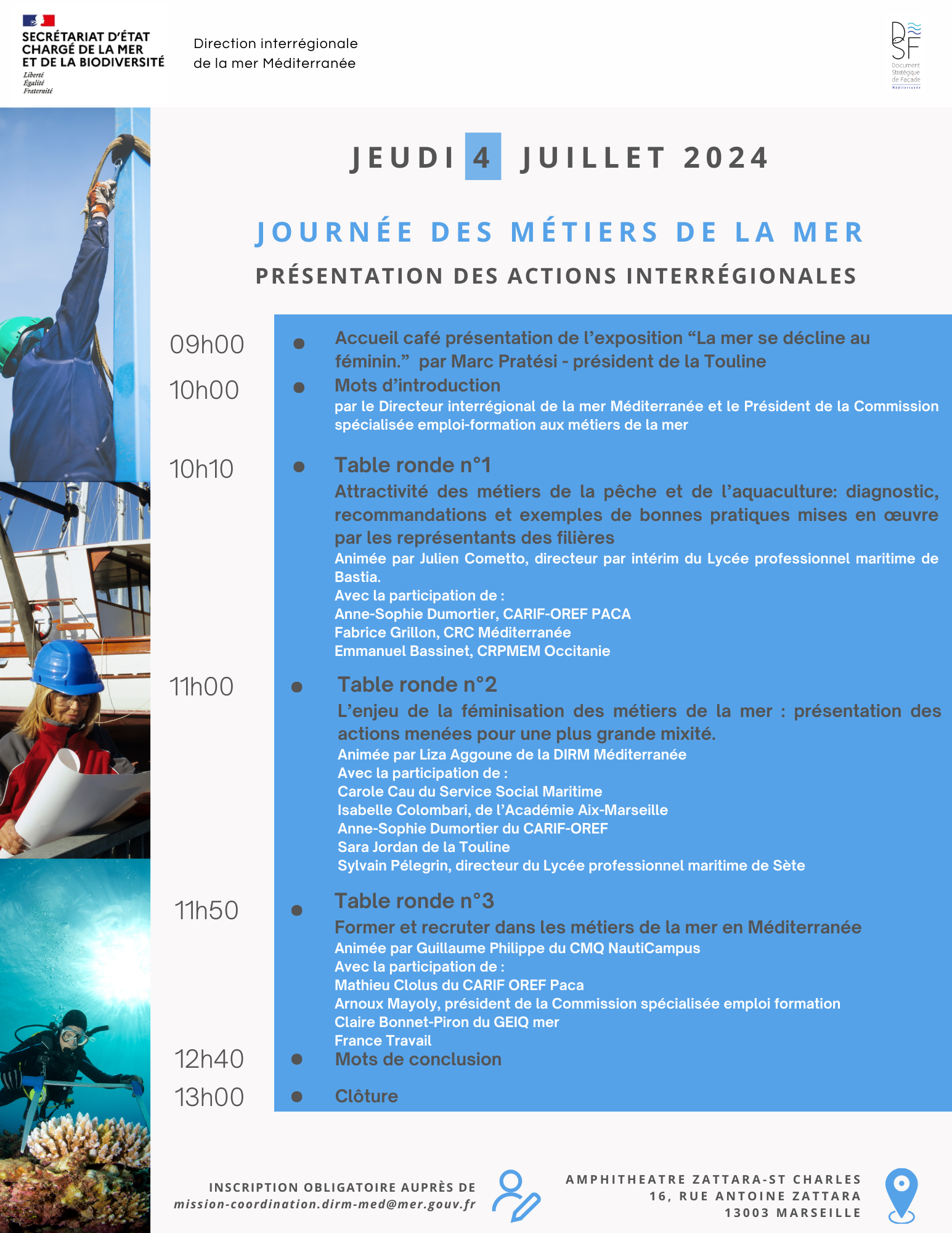 A l'occasion de cette matinée, Sarah, chargée de Projet à La Touline, interviendra lors de la table ronde dédiée à la féminisation des métiers : présentation des actions menées. L'Expo "La mer se décline au féminin" est présente et visible jusqu'au 5 juillet dans le hall d'accueil de la Direction Interrégionale de la Mer en Méditerranée.