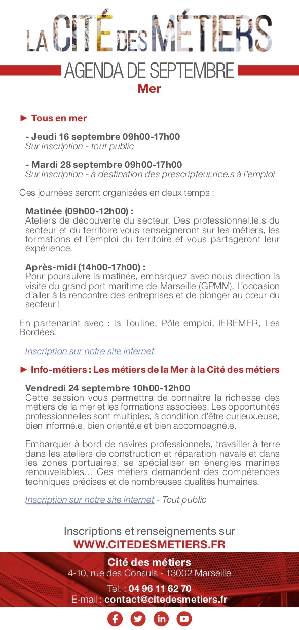 Retrouvez ci-dessous le programme, les inscriptions se font auprès de la Cité des Métiers ici